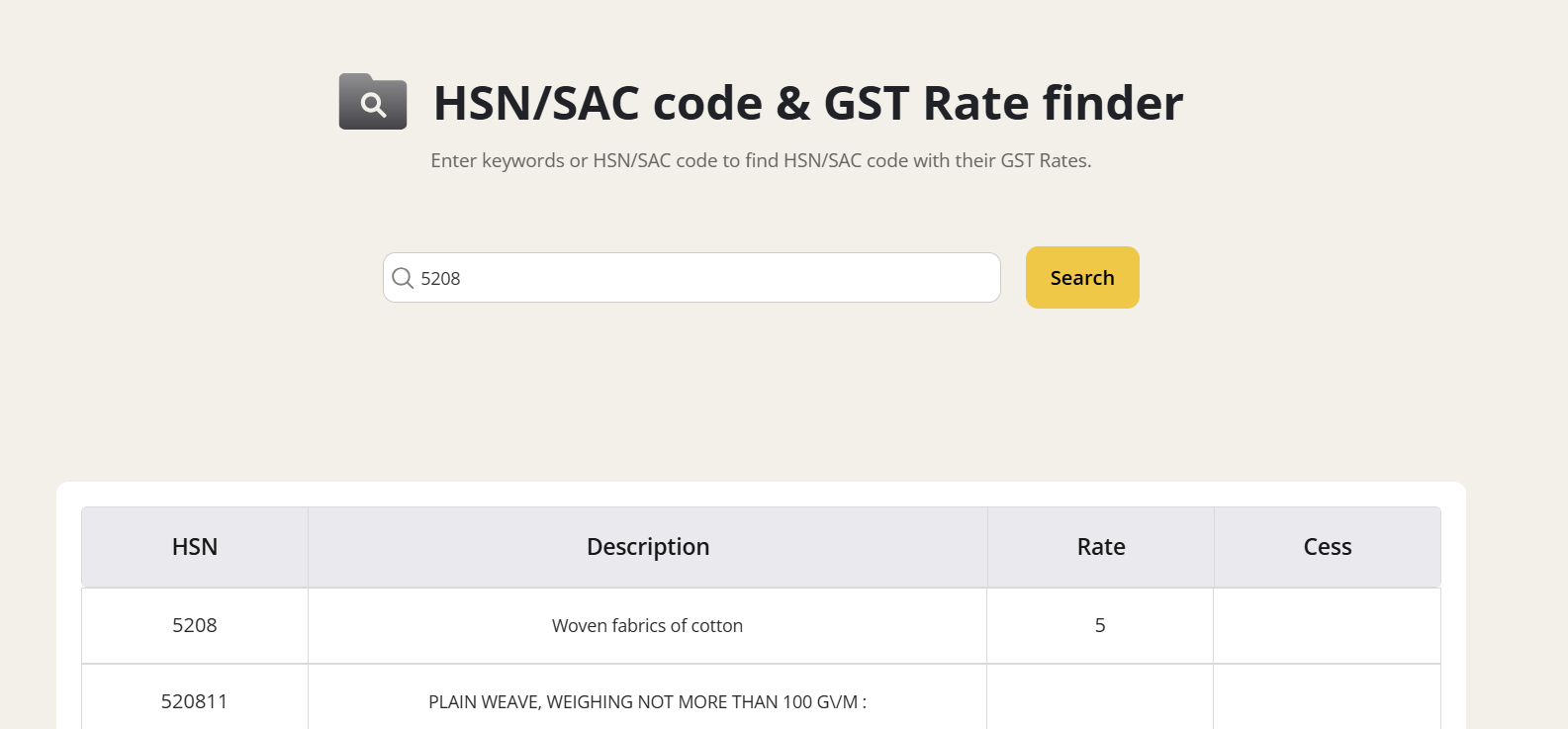- Retail sellers of sarees or bedsheets below ₹2500 each use HSN 5208 and apply 5% GST on all invoices.