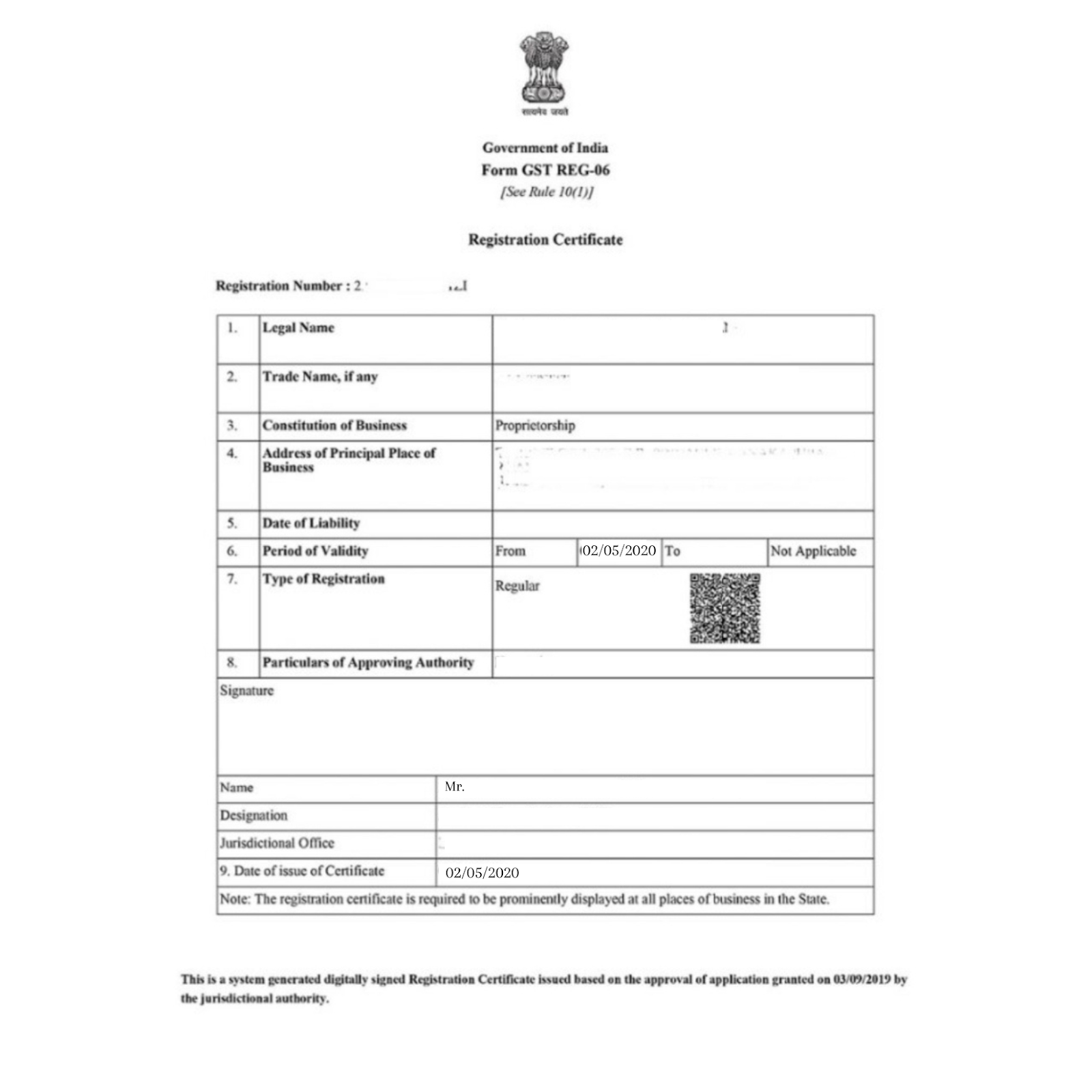 A GST certificate (FORM GST REG-06) is a document provided by the Indian government to Indian businesses that are registered for GST. It proves that a business is registered for GST, which helps businesses to legally collect GST, claim input tax credit, and build trust with vendors and customers.